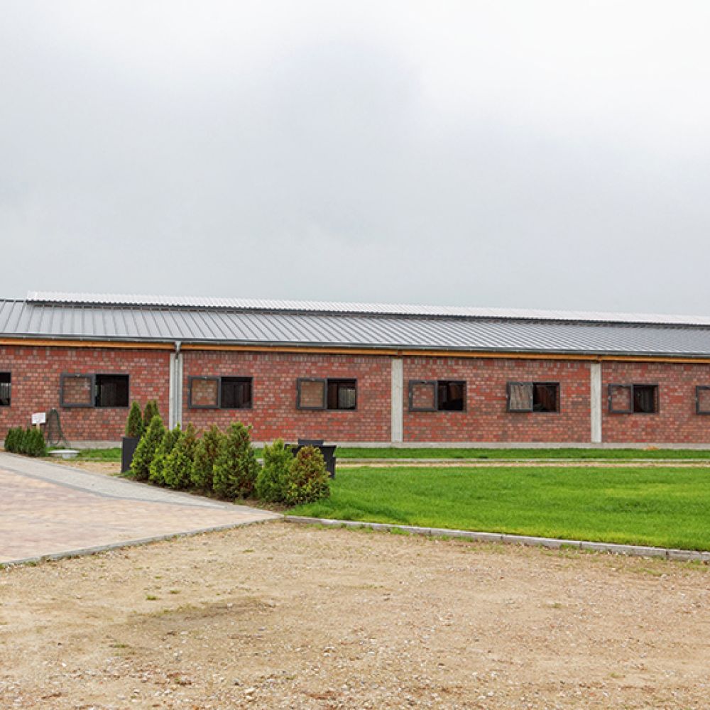 Die Bewegungshalle weist ein Hufschlagmaß von 20,00 x 60,00 m auf, wobei die Stalltrakte V-Förmig angeordnet sind. Im Zwischentrakt sind neben der Sattelkammer auch die Wasch- und Putzplätze untergebracht. Die Dacheindeckung besteht aus einem modernen Isodach.